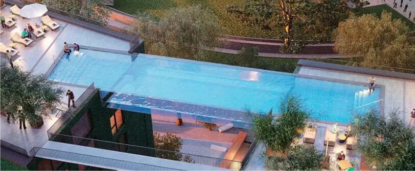 未来,在2栋住宅塔楼10层高的位置将由一座全玻璃打造的空中泳池梁连接。游泳者可通过泳池玻璃俯瞰高35米的景色。