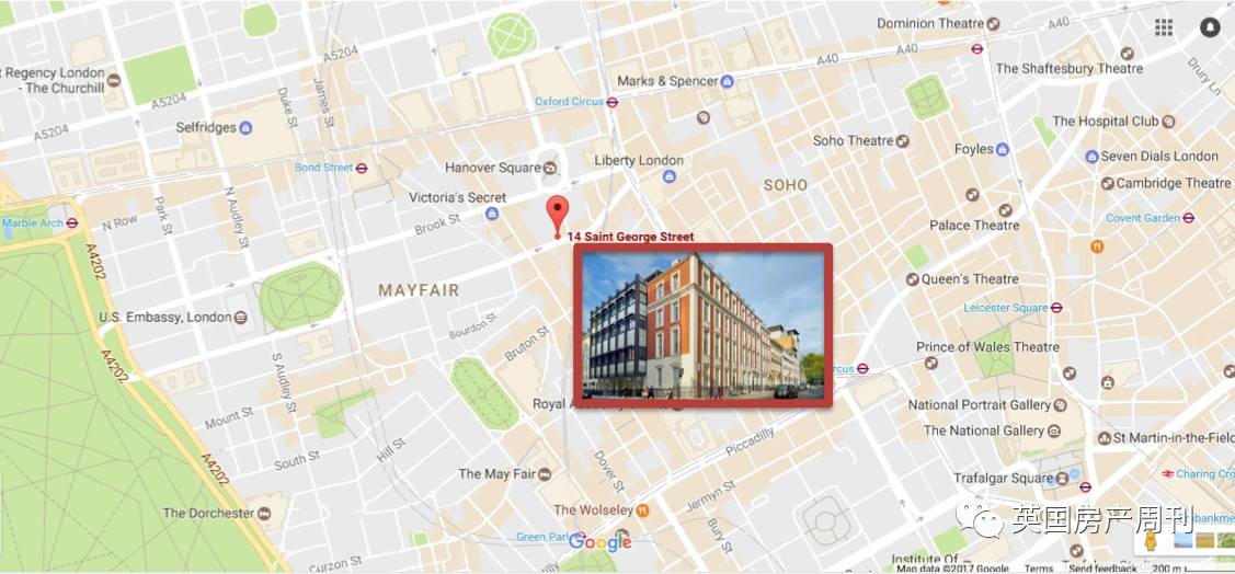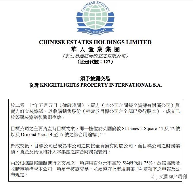 2017年5月7日,香港上市公司华人置业发布公告,以1.75亿英镑(约17.6亿港元)通过其间接全资附属公司,以股权交易形式收购伦敦圣詹姆斯广场11及12号以及Ormond Yard14至17号的综合式商用物业。租金回报率约为4.25%。